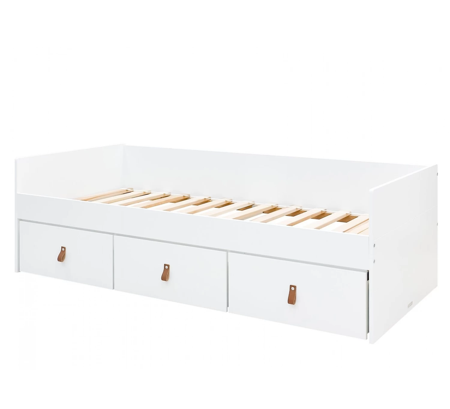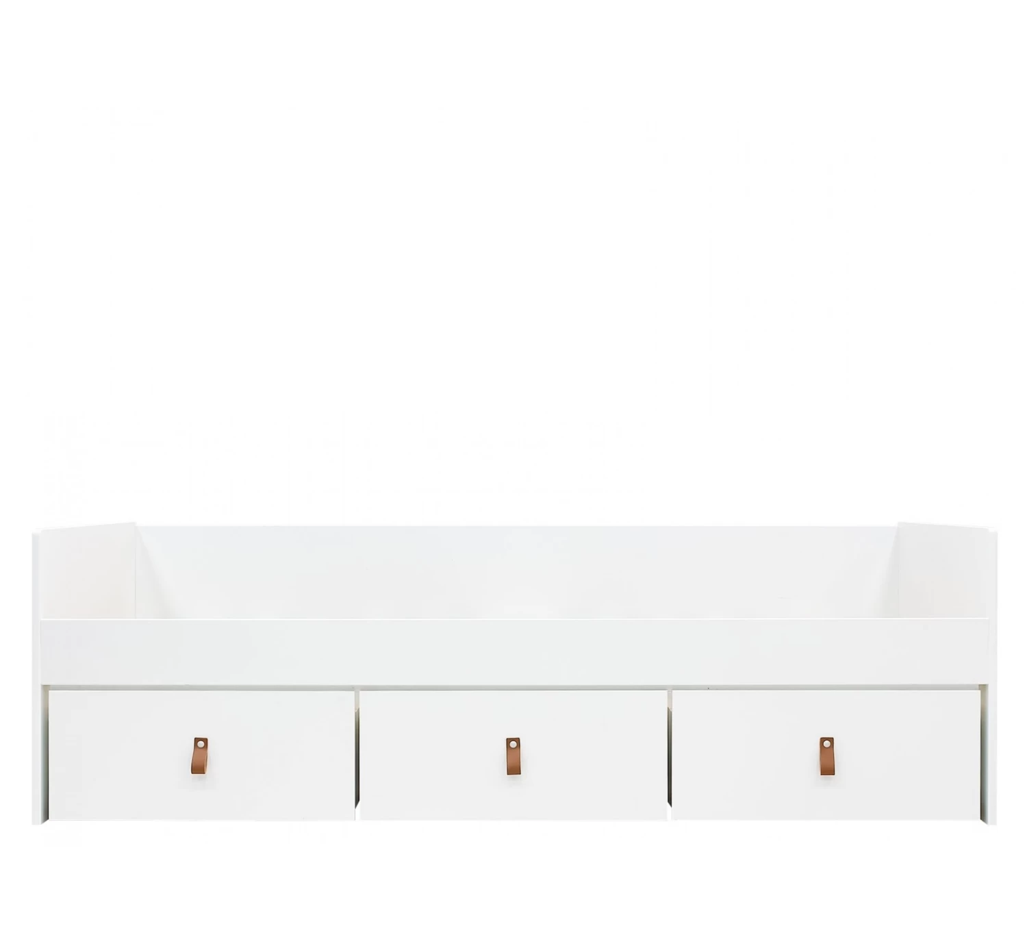 Deze mooie bedbank van Indy is een aanwinst voor iedere kinderkamer. Het bed is voorzien van drie lades waarin je kindje allerlei spulletjes of kleding kan opbergen. De handvatten zijn voorzien van kunstlederen lusjes, wat weer een leuk een speels effect geeft aan het bed. Het bed heeft een matrasmaat van 90×200 cm.