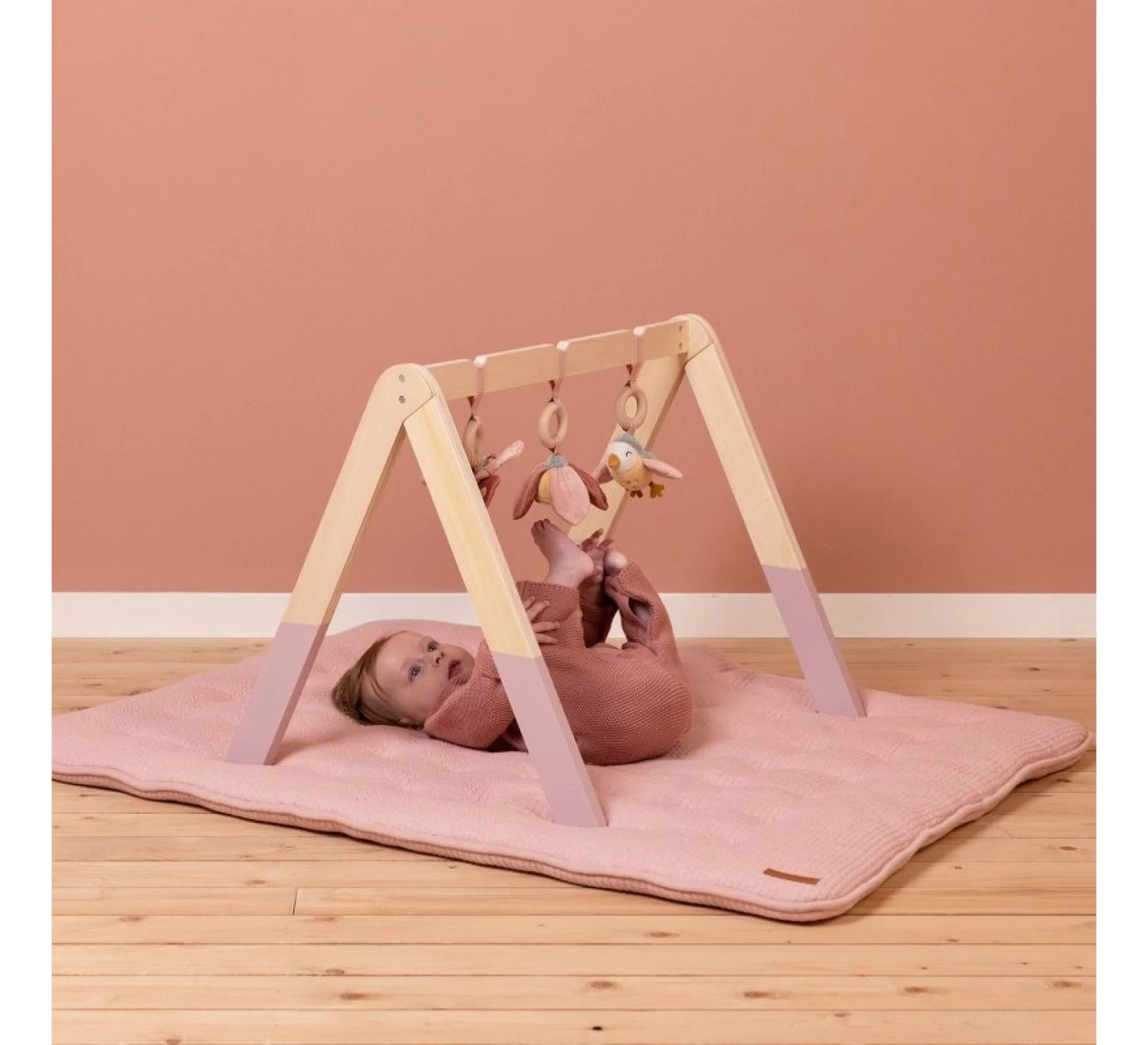De babygym is gemaakt van stevig hout en er hangen verschillende zachte speeltjes aan houten ringen. De speeltjes hebben verschillende kleuren en vormen waardoor je kindje gestimuleerd wordt om er lekker mee te spelen.