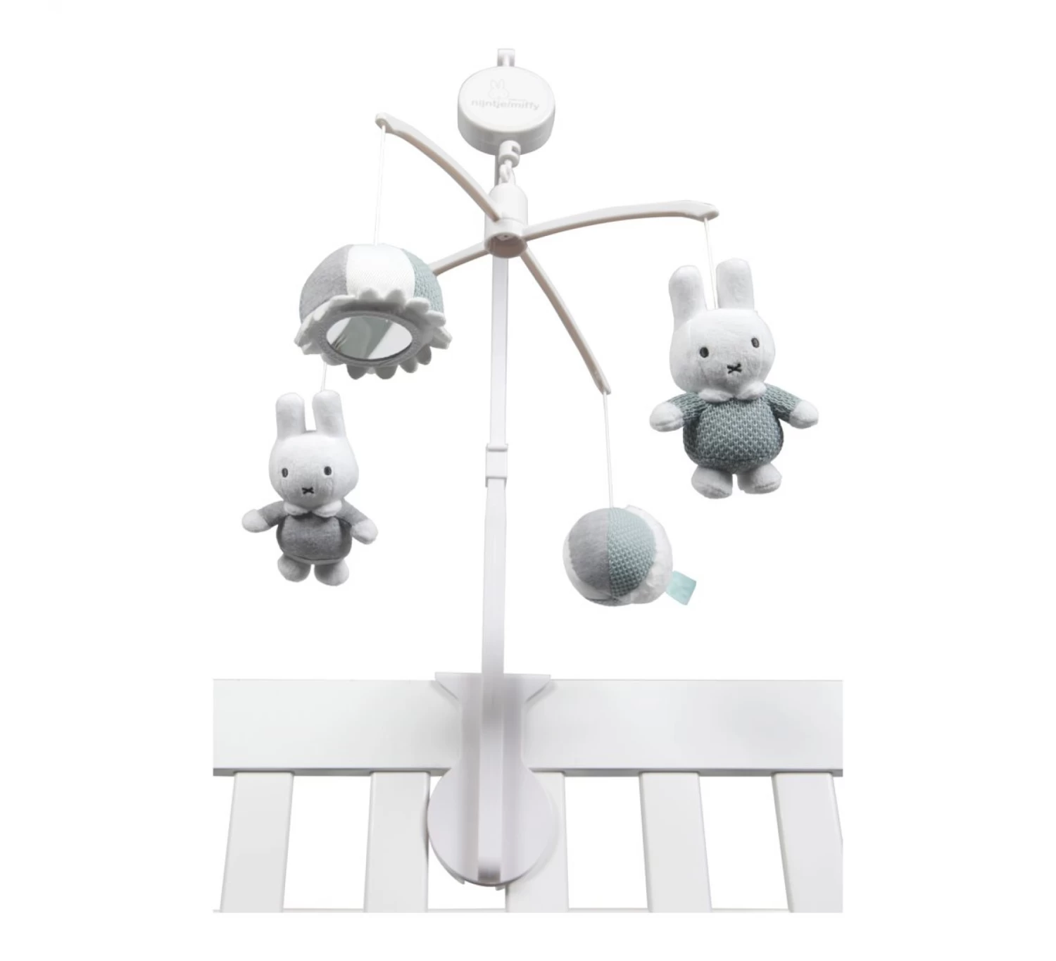 De muziekmobiel van Nijntje is eenvoudig te bevestigen aan de box. Het heeft één melodie: Brahms Lullaby. Aan de mobiel hangen vier speeltjes: twee konijntjes, een balletje en een spiegel. Een muziekmobiel werkt rustgevend voor de baby en leert je kleintje om te leren kijken en te volgen.