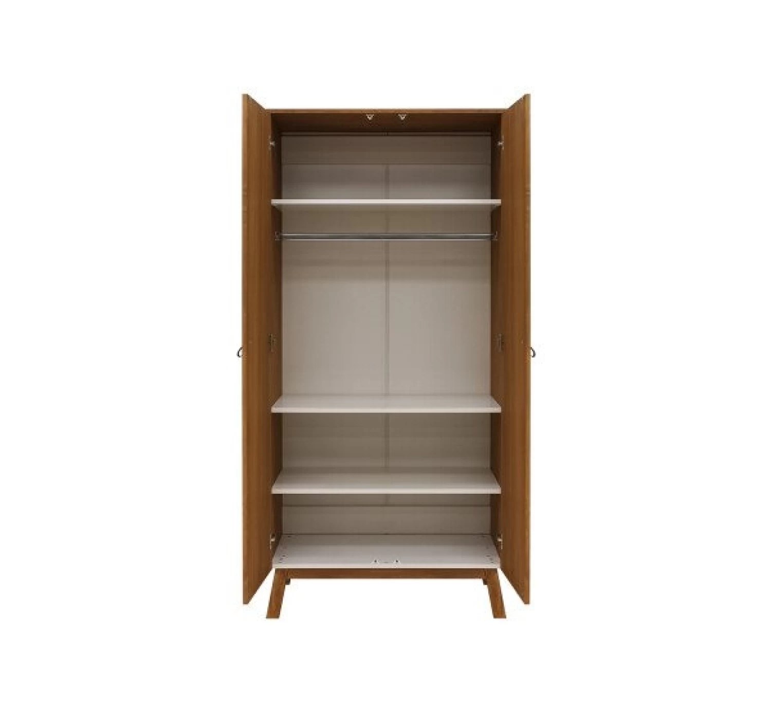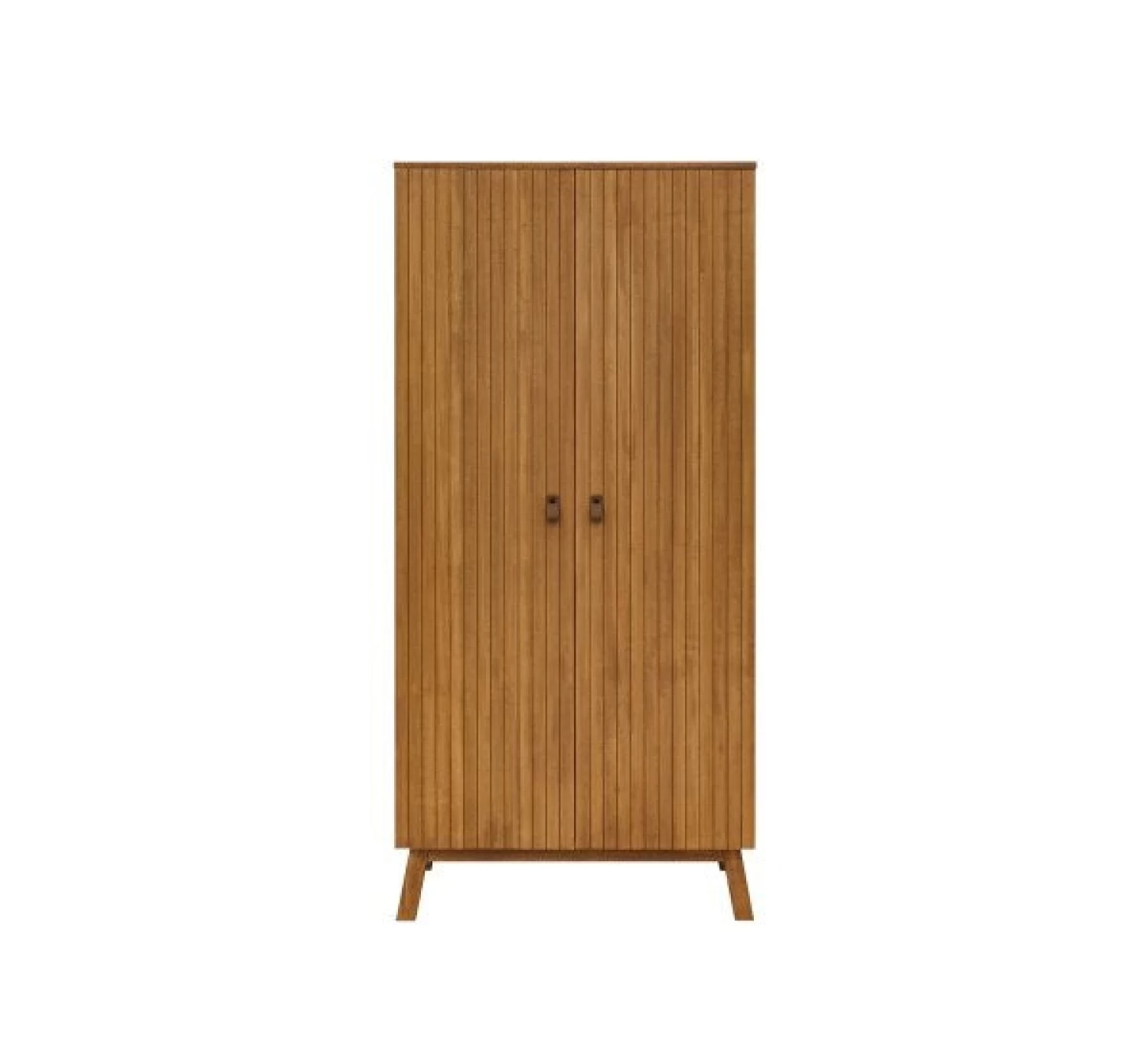 Deze 2-deurskast van de serie Senna is voorzien van verfijnde verticale groeven in de deuren en staat op schuin geplaatste poten. De handgrepen zijn in leer uitgevoerd. De kast is afgewerkt met een lak op waterbasis en geeft het een warme uitstraling. Achter de deuren bevinden zich drie in hoogte verstelbare legplanken en een hangroede.